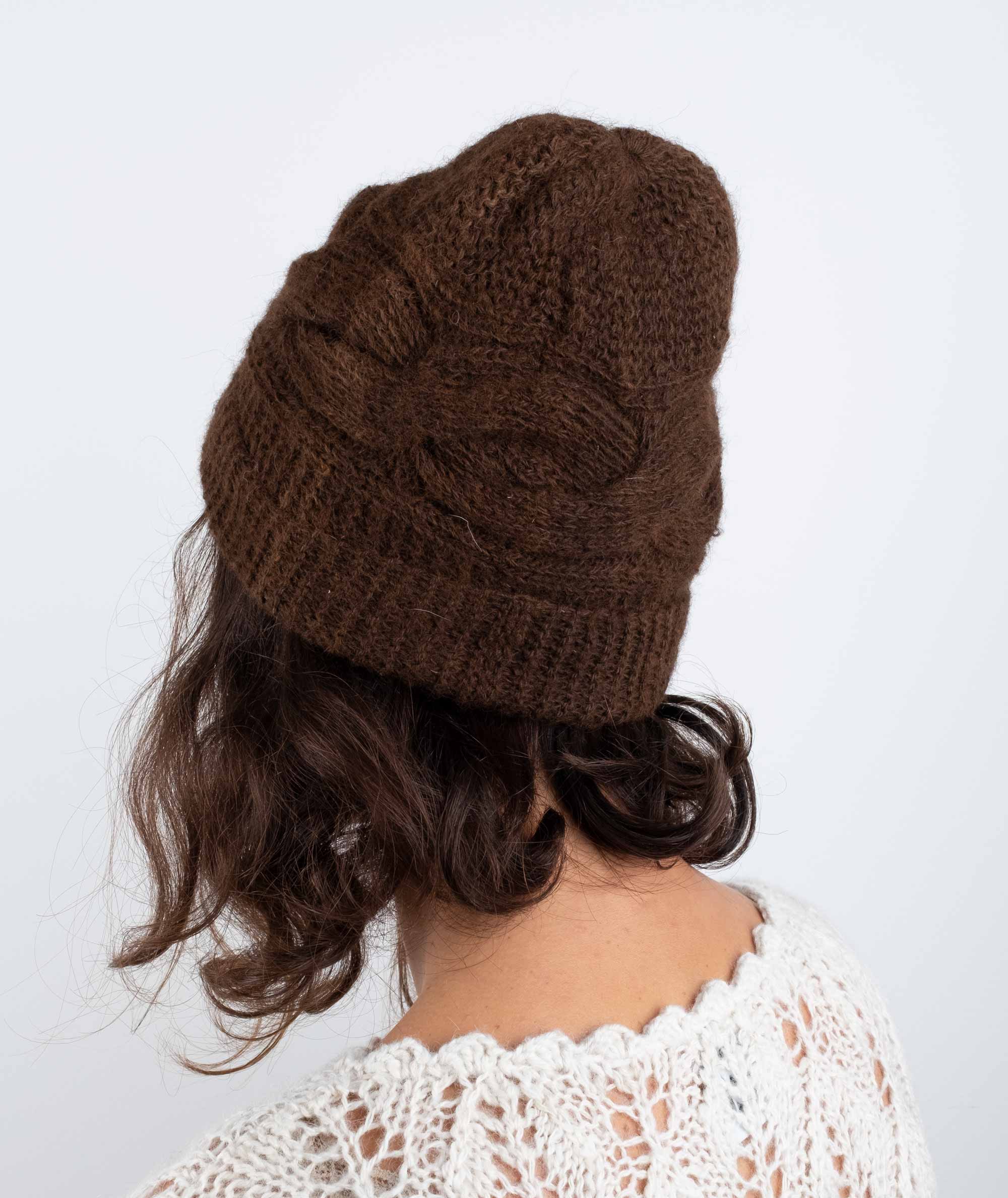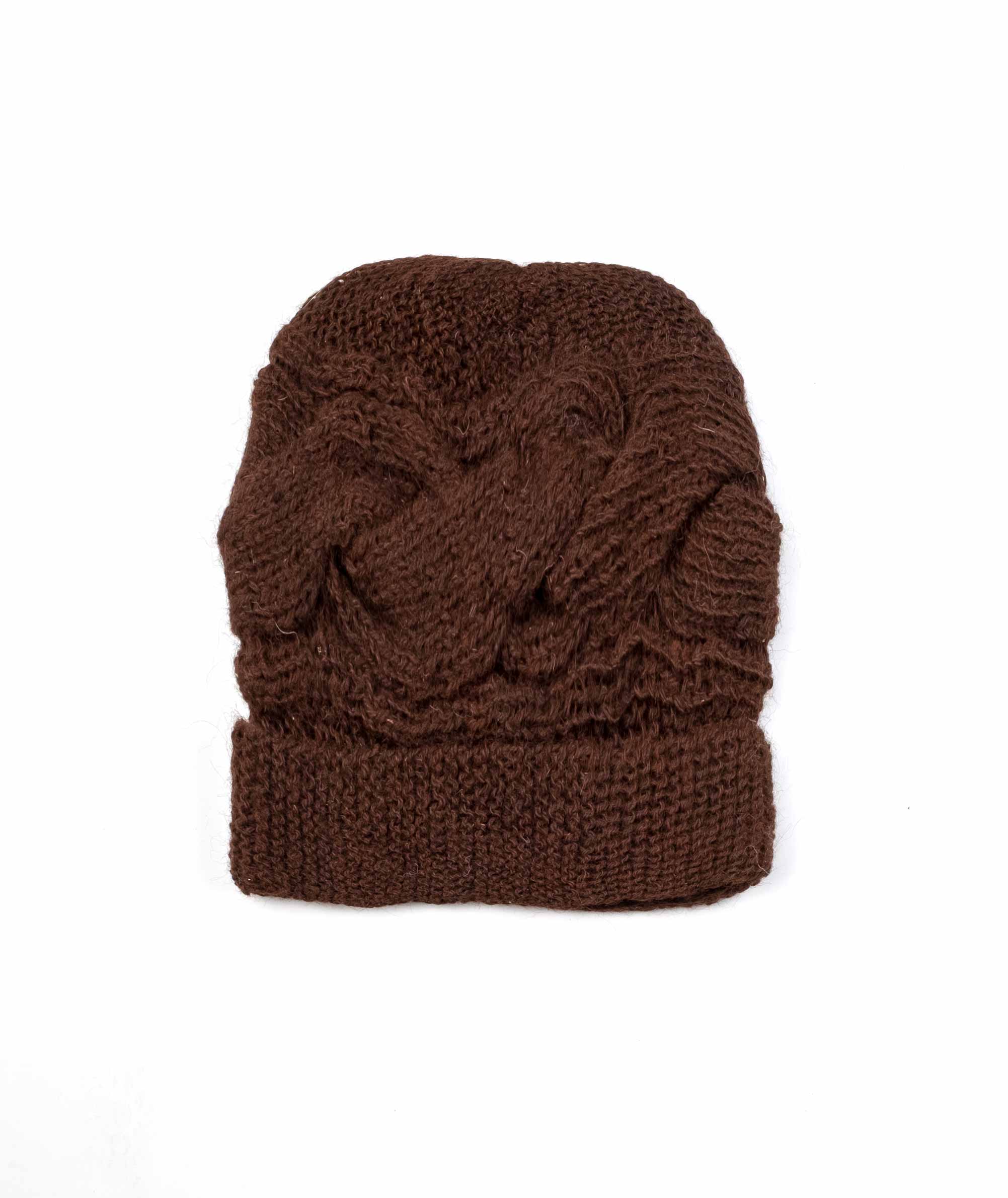 Gorro unisex, de un solo color con doble pretina y con fantasia central a trenza. Hecho a mano en 100% lana de alpaca bebe.