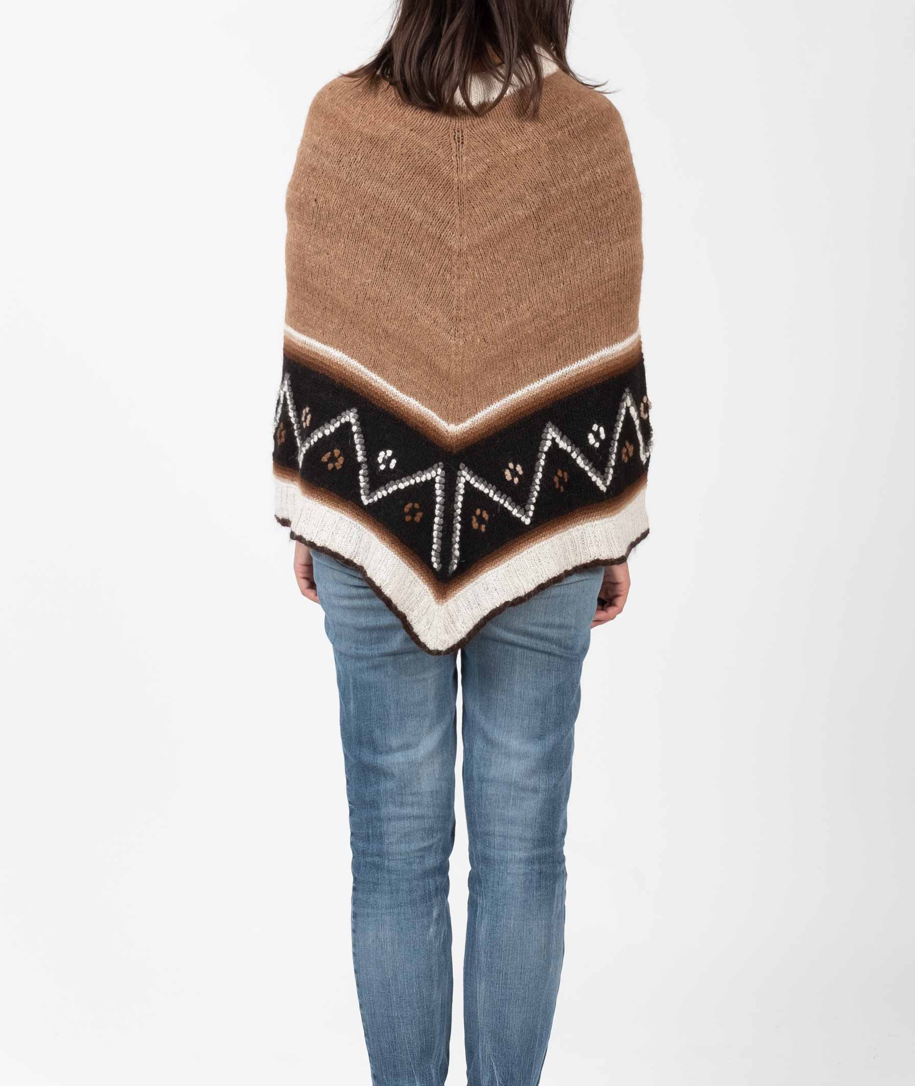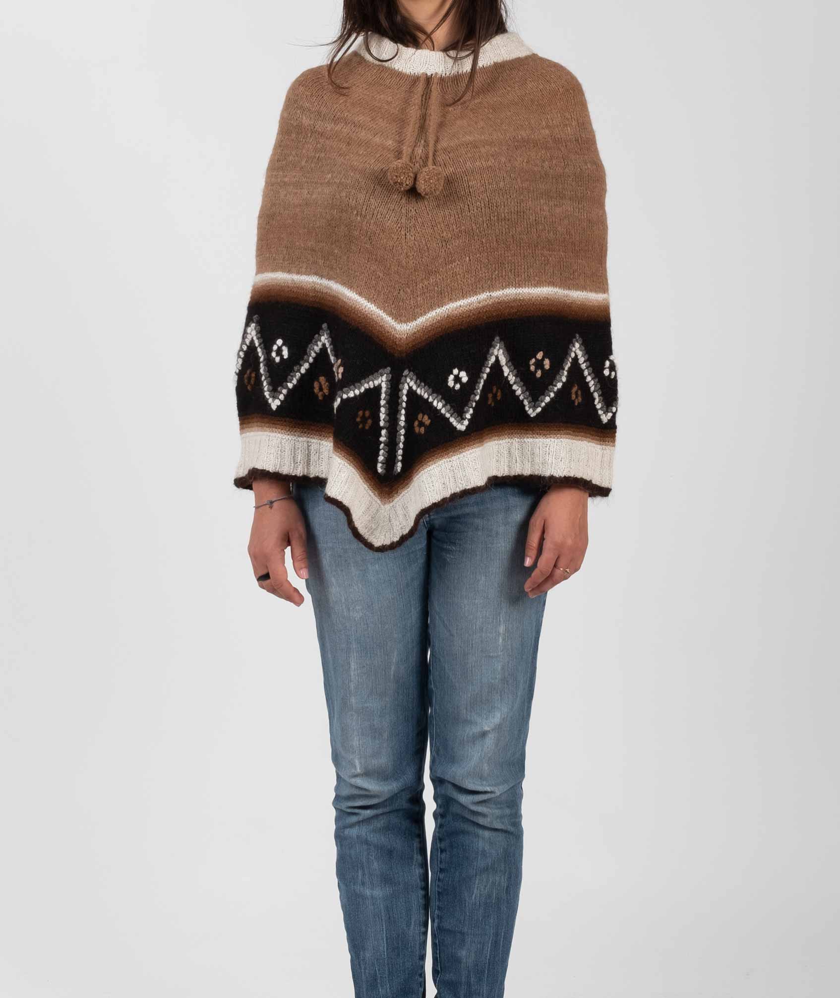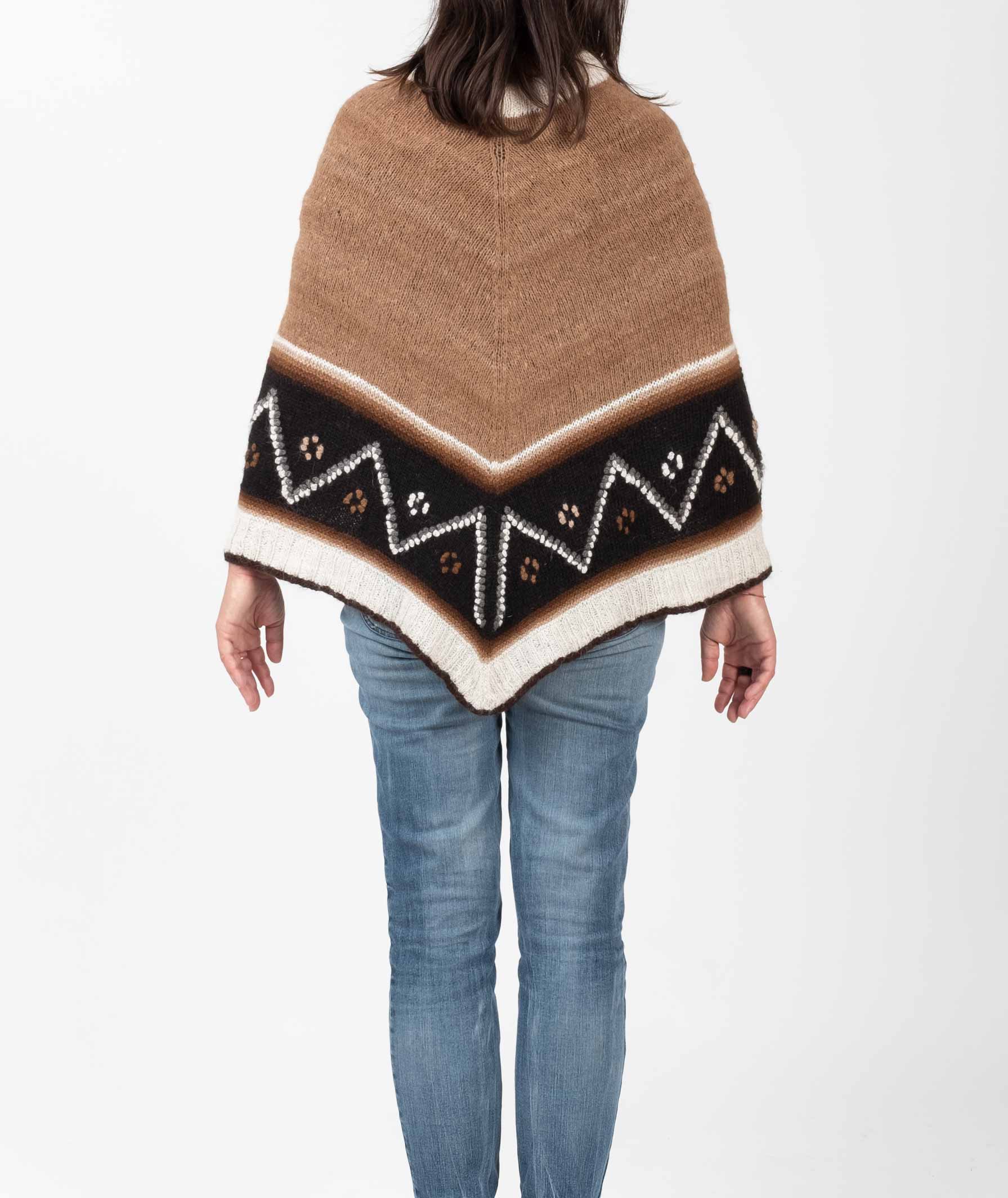 Poncho femminile con greca zigzagata inferiore ricamata. Fatto a mano in 100% alpaca bebe. Punti jersey e pasas per i ricami. Un capo da indossare in qualsiasi evenienza.